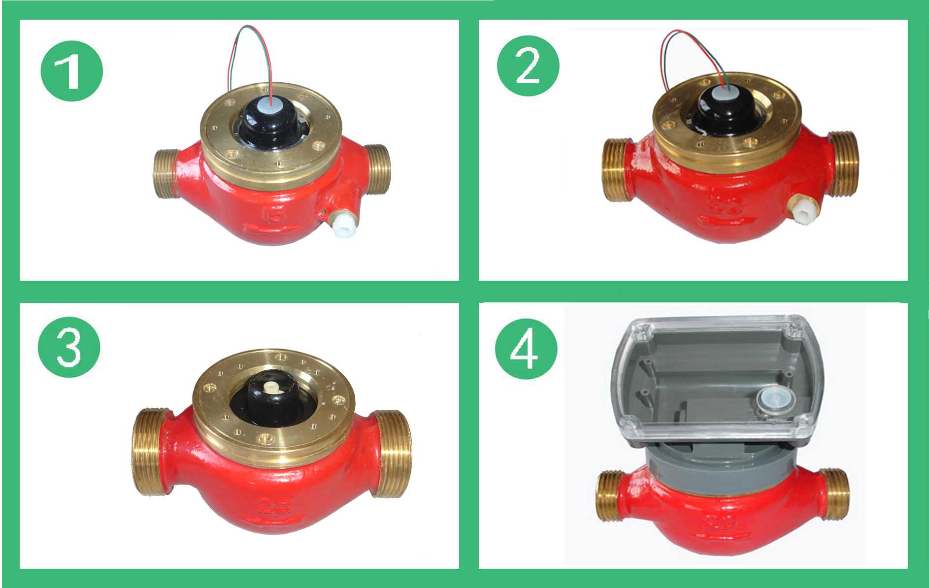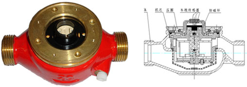 DS97TAR多流束有磁熱量表流量計的結構如圖,其工作原理是:熱水進入流量計,經(jīng)進水導向孔沖擊計量腔內的葉輪旋轉,再經(jīng)出水導向孔流出流量計。葉輪上面嵌有磁鋼隨葉輪旋轉,在隔板上端的韋根遠傳組件,接受葉輪旋轉的周期信號。其殼體采用優(yōu)質黃銅,經(jīng)鑄造、數(shù)控機床和組合機床加工,機械強度好、尺寸精度穩(wěn)定一致,塑料零件選用進口的高強度耐熱工程塑料,密封件采用優(yōu)質耐熱材料。因此,該流量計完全能夠適應國內供熱系統(tǒng)的惡劣工作環(huán)境。