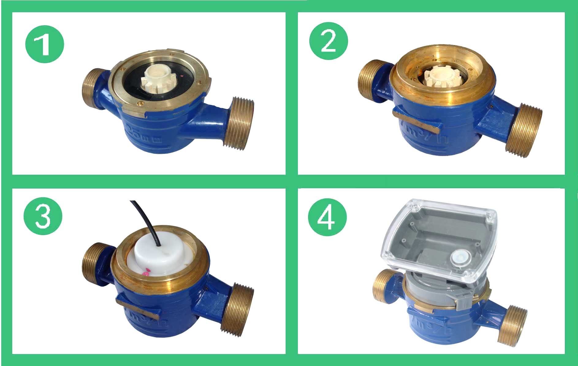 單流束有磁熱量表流量計的結(jié)構(gòu)如圖,其工作原理是:熱水進入流量計,經(jīng)進水導向孔沖擊計量腔內(nèi)的葉輪旋轉(zhuǎn),再經(jīng)出水導向孔流出流量計。葉輪上面嵌有磁鋼隨葉輪旋轉(zhuǎn),在隔板上端的韋根遠傳組件,接受葉輪旋轉(zhuǎn)的周期信號。單流束有磁熱量表流量計的殼體采用優(yōu)質(zhì)黃銅,經(jīng)金屬模鑄造、數(shù)控機床和組合機床加工,機械強度好、尺寸精度穩(wěn)定一致,塑料零件選用進口的高強度耐熱工程塑料,密封件采用優(yōu)質(zhì)耐熱材料。因此,該流量計完全能夠適應國內(nèi)供熱系統(tǒng)的惡劣工作環(huán)境。